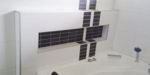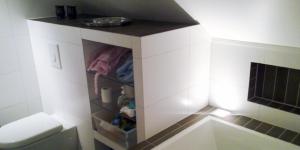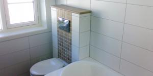 Vi hadde gjort alt arbeidet på baderoms renovasjons projektet. Vi hadde skiftet rør og montert baderomsmøbler. Også betong ble lagt på gulvet, membran ble smurt og dessuten ble fliser lagt.